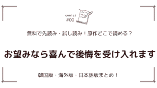 原作どこで読める? 無料先読み!?『お望みなら喜んで後悔を受け入れます』原作漫画どこで読める?韓国版・海外版・日本語版まとめ! 『お望みなら喜んで後悔を受け入れます』原作Webtoonの配信サイトを徹底解説!日本語版(LINEマンガ)の無料試し読み、韓国版の最新情報、完結状況をまとめています 2025.12.26 原作どこで読める?