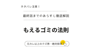 ネタバレ注意!もえるゴミの法則【41話~50話】あらすじ。完結結末:最新話まで掲載!もえるゴミの法則「41話・42話・43話・44話・45話・46話・47話・48話・49話・50話」…最終話までネタバレを含む内容となっていますので、未読の方はご注意ください!男に懲りたソミ、大学生活は静かに過ごすつもり。だが下宿で待っていたのは、想像以上のクズ男チャヌだった。